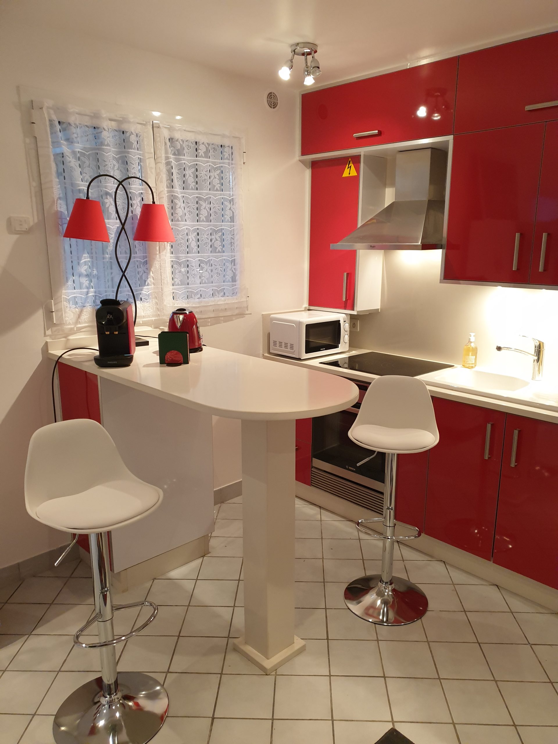 Four, plaque de cuisson, réfrigérateur, micro-ondes, machine à café Nespresso avec 10 capsules offertes bouilloire électrique.